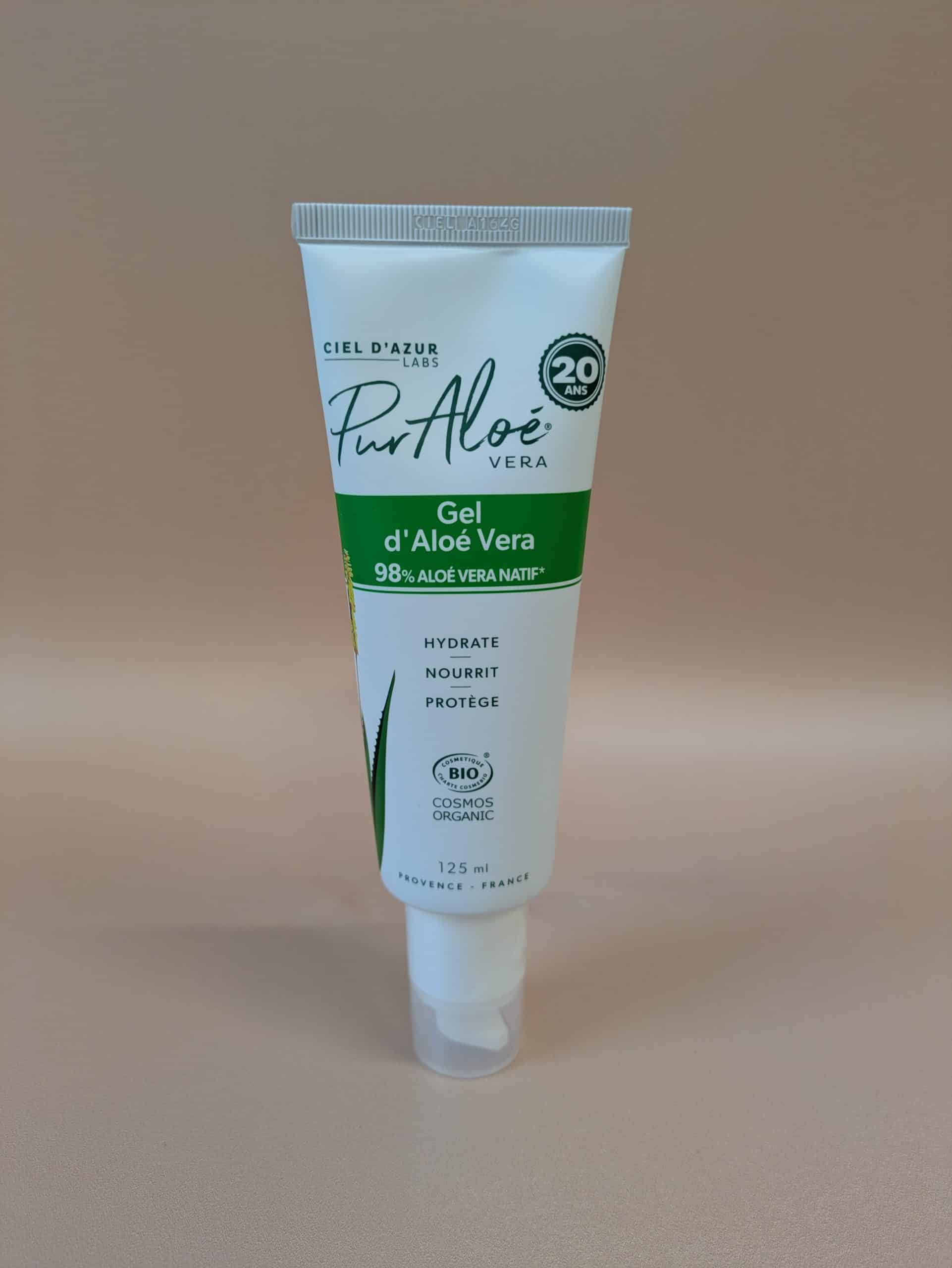 – Un gel d’aloé vera, Ciel d’azur, format 125ml. Il nourri, protège et hydrate. Formulé à partir de 98% d’aloé vera natif bio et équitable. L’aloé vera aide à fixer l’hydratation de nos huiles de soin. Prélevez une noisette de gel d’aloé vera et mélangez quelques gouttes de notre huile de soin en son cœur. Appliquez telle une crème sur le visage et le cou.