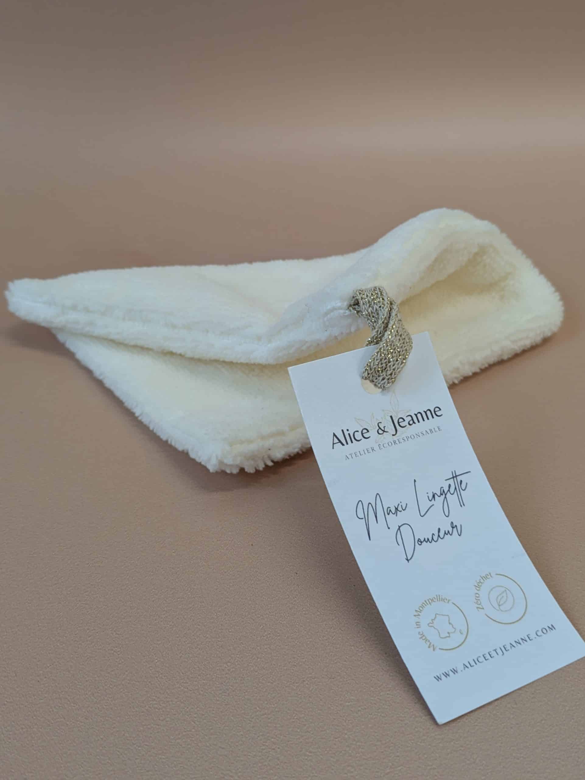 – Une lingette doux doux, Alice&Jeanne. La lingette Doux Doux permet grâce à sa forme et sa douceur d’effectuer un démaquillage délicat. Elle permet également d’enlever un masque de beauté, de débarbouiller, de nettoyer le visage ou le corps des grands comme des petits grâce à sa taille généreuse.
